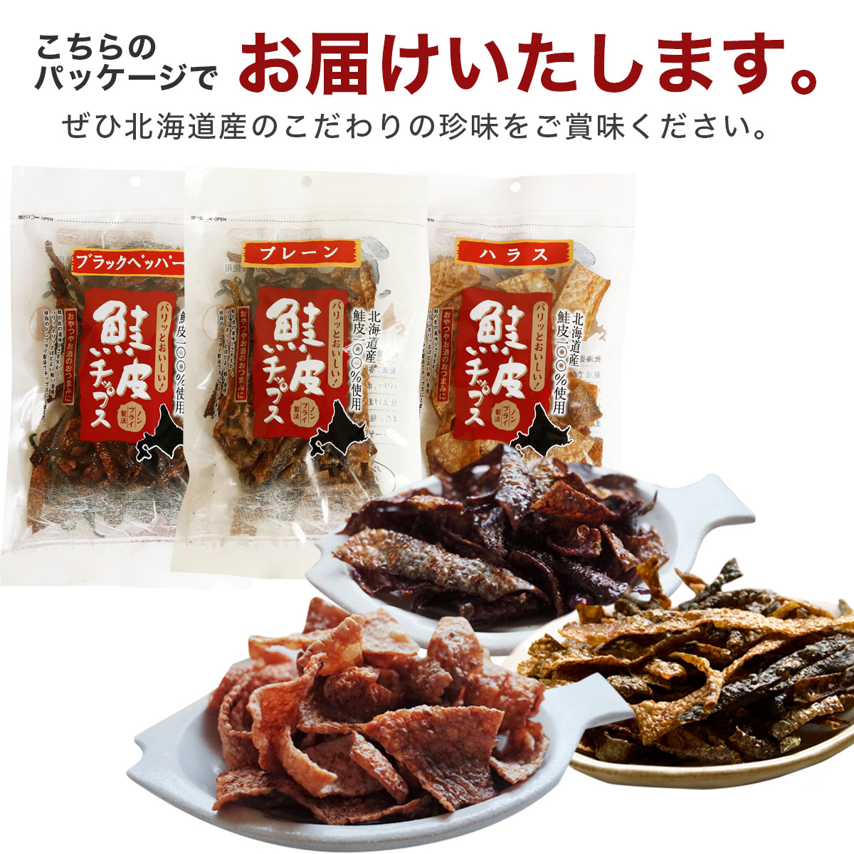 | 原材料 | 鮭【プレーン】鮭皮(北海道産)、食塩、砂糖、たんぱく加水分解物/ソルビット、調味料(アミノ酸等)、くん液、紅麹色素、pH調整剤、(一部にさけ・大豆を含む) 【ブラックペッパー】鮭皮(北海道産)、還元水飴、醤油、食塩、砂糖、たんぱく質加水分解物、砂糖混合ぶどう糖果糖液糖、こしょう、かつお節エキス、酵母エキス/酒精、調味料(アミノ酸等)ソルビット、グリセリン、香料、着色料(パプリカ色素、紅麹色素)、くん液、pH調整剤、甘味料(ステビア)、ビタミンB1、保存料(ソルビン酸K)、(一部にさけ・小麦・乳成分・大豆を含む) 【ハラス】ハラス皮(北海道産)、食塩、砂糖、たんぱく加水分解物/ソルビット、調味料(アミノ酸等)、くん液、紅麹色素、pH調整剤、(一部にさけ・大豆を含む) |