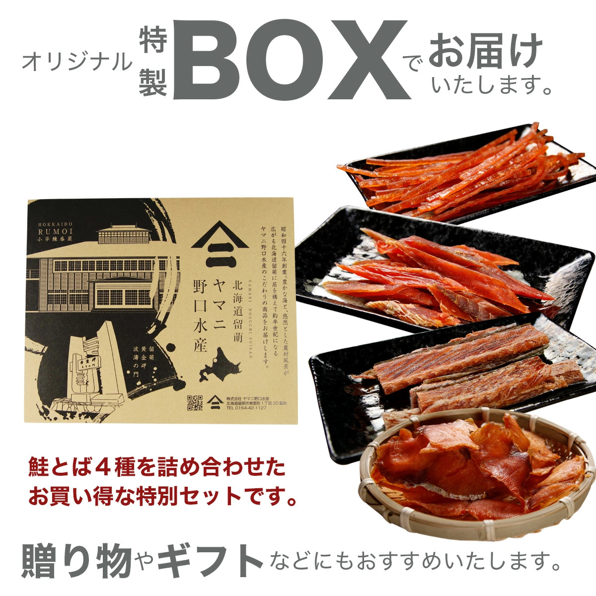 | 原材料 | 【塩とば】鮭(北海道産)、塩【本燻製鮭とば】鮭(北海道産)、食塩、米発酵調味料、砂糖、ぶどう糖、香辛料/ソルビット、調味料(アミノ酸等)、(一部にさけを含む)【プレミアムカットサーモン】鮭(北海道産)、食塩、砂糖、たんぱく加水分解物/ソルビット、調味料(アミノ酸等)、くん液、紅麹色素、pH調整剤、(一部にさけ・大豆を含む)【ナチュラルサーモンジャーキー】鮭(北海道産)、プレーン、果糖、還元水飴、たんぱく質加水分解物、食塩、野菜エキス(玉葱、人参、キャベツ)、発酵調味料(一部にさけ・小麦・大豆を含む) |