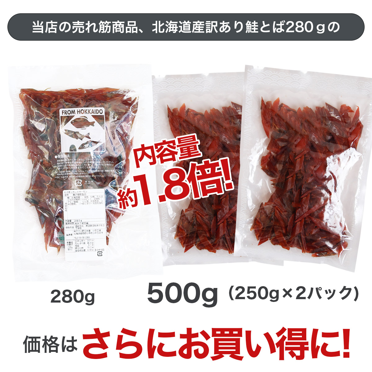 送料無料 北海道産 カットサーモン 500g 鮭 しゃけ シャケ とば トバ 鮭とば 鮭トバ 珍味 おつまみ 鮭とば500g(250g×2パック ) 北海道産 業務用 とば おつまみ さけとば 鮭トバ 珍味 北海道 つまみ 常温 皮なし 鮭 しゃけ カットサーモン シャケ 乾物 乾き物 酒の肴 サーモン お取り寄せグルメ おやつ 日本酒 ビール (n-s-006) 商品詳細 商品名北海道産 カットサーモン 内容量500g(250g×2パック) 原材料鮭(北海道産)、食塩、砂糖、たんぱく質加水分解物/ソルビット、調味料(アミノ酸等)、くん液、紅麹色素、pH調整剤、(一部にさけ・大豆を含む) 賞味期限製造日から90日 保存方法直射日光、高温多湿を避け常温で保存 製造者(株)ヤマニ野口水産 宅配便に変更で配送早め&ギフト対応可 選択してください このまま送料無料 +650円で宅配便に変更 沖縄・離島の場合、送料+650円(宅配便) 了承して注文する 宅配便へ変更の場合、送料は別途ご連絡いたします 了承して注文する ご自宅のポストへ投函されます 了承して注文する お届け先が違う場合は予め相手方にご連絡をお願いいたします 了承して注文する 複数注文の場合は、発送方法についてご相談する場合があります 了承して注文する 再配達の場合は別途送料が発送します 了承して注文する ギフト対応ご希望の際はご注文の際、備考欄にご入力ください 了承して注文する 在庫状態 : 在庫有り ¥5,800(税込) 数量