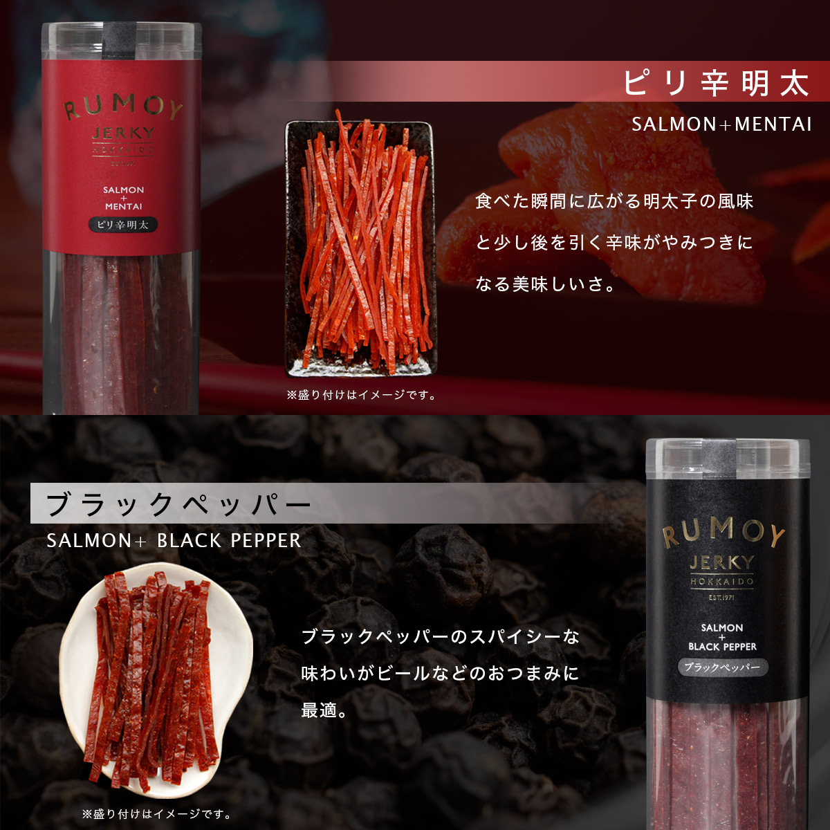 | 原材料 | 【鮭とば】鮭(北海道産)、食塩、砂糖、たんぱく質加水分解物/ソルビット、調味料(アミノ酸等)、くん液、紅麹色素、pH調整剤、(一部にさけ・大豆を含む) 【ピリ辛明太】鮭(北海道産)、還元水飴、醤油、食塩、砂糖混合ぶどう糖果糖液糖、砂糖、かつお節エキス、香辛料、酵母エキス/酒精、グリセリン、調味料(アミノ酸等)、pH調整剤、パプリカ色素、甘味料(ステビア)、保存料(ソルビン酸K)、香辛料抽出物、ビタミンB1、くん液、(一部にさけ・小麦・乳成分・大豆を含む) 【鮭プレーン】鮭(北海道産)、砂糖混合ぶどう糖果糖液糖、醤油、みりん、食塩/ソルビット、トレハロース、調味料(アミノ酸等)、(一部にさけ・小麦、大豆を含む) 【ブラックペッパー】鮭(北海道産)、還元水飴、醤油、砂糖混合ぶどう糖果糖液糖、食塩、こしょう、かつお節エキス、砂糖、酵母エキス/酒精、調味料(アミノ酸等)、グリセリン、香料、パプリカ色素、pH調整剤、甘味料(ステビア)、ビタミンB1、保存料(ソルビン酸K)、くん液、(一部にさけ・小麦・乳成分・大豆を含む) 【バジル】鮭(北海道産)、砂糖混合ぶどう糖果糖液糖、醤油、みりん、食塩、バジル/ソルビット、トレハロース、調味料(アミノ酸等)(一部にさけ・小麦・大豆を含む) |